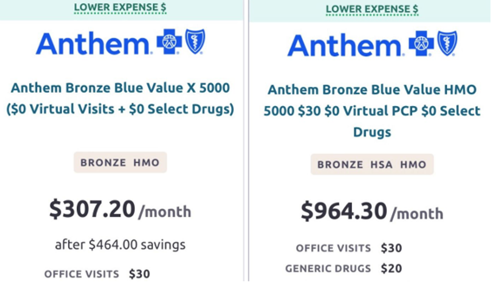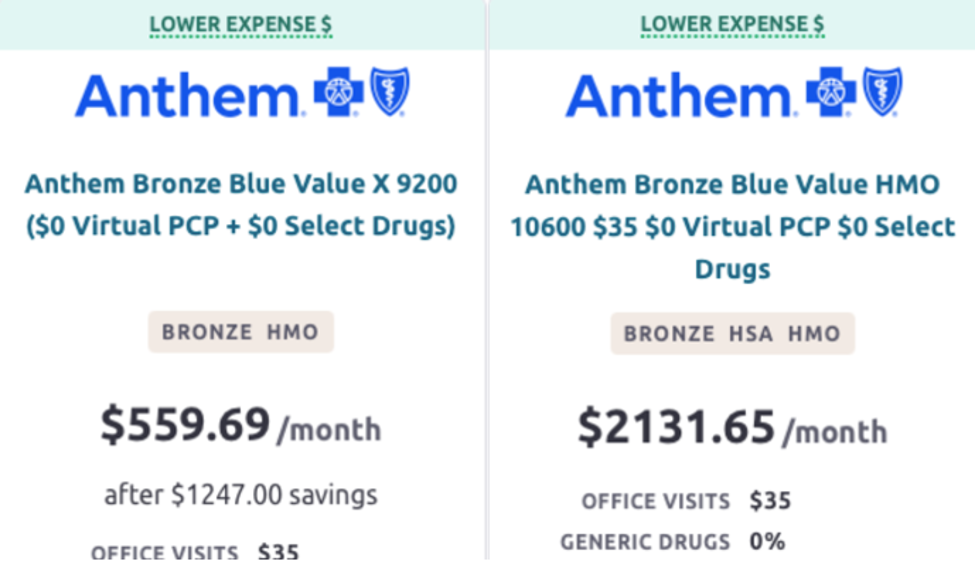 Anthem Bronze plan with same deductible, same co-pay, but 2025 premiums vs 2026 premiums for someone making $65k a year