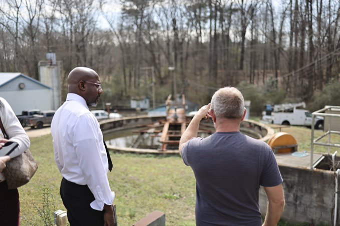 Above: Senator Warnock surveys Social Circle’s wastewater treatment site, which would struggle to support a mass detention facility in the community